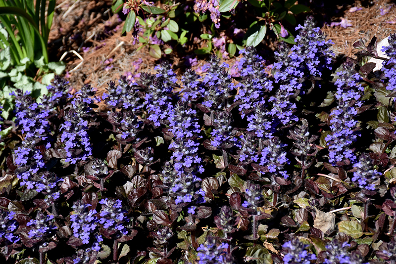 Black Scallop Bugleweed's attractive small crinkled round leaves emerge dark green in spring, turning deep purple in color the rest of the year on a plant with a spreading habit of growth. It features subtle spikes of blue flowers rising above the foliage from mid spring to early summer.