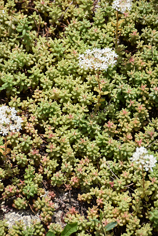 A compact groundcover stonecrop with white flowers held atop of light green tear shaped foliage; a drought-tolerant perennial that does best in poor soils, an excellent choice for containers, edging and rock gardens