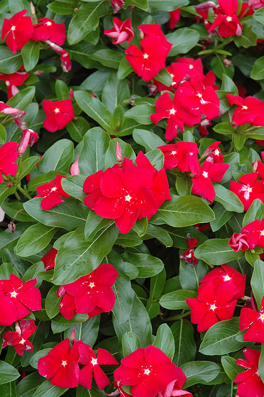 Cora® Red Vinca features showy red star-shaped flowers at the ends of the stems from late spring to mid fall. Its glossy oval leaves remain dark green in color throughout the year.