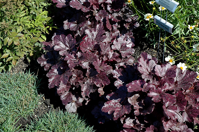 Grape Expectations Coral Bells features dainty spikes of white bell-shaped flowers rising above the foliage from late spring to mid summer. Its attractive crinkled lobed leaves remain plum purple in color with showy silver variegation and tinges of dark red throughout the year. The deep purple stems can be quite attractive.