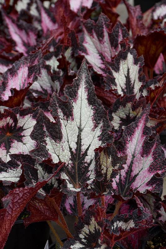 Jurassic Silver Point Begonia's attractive large twisted heart-shaped leaves remain silver in color with distinctive black edges and tinges of rose throughout the year on a plant with an upright spreading habit of growth.