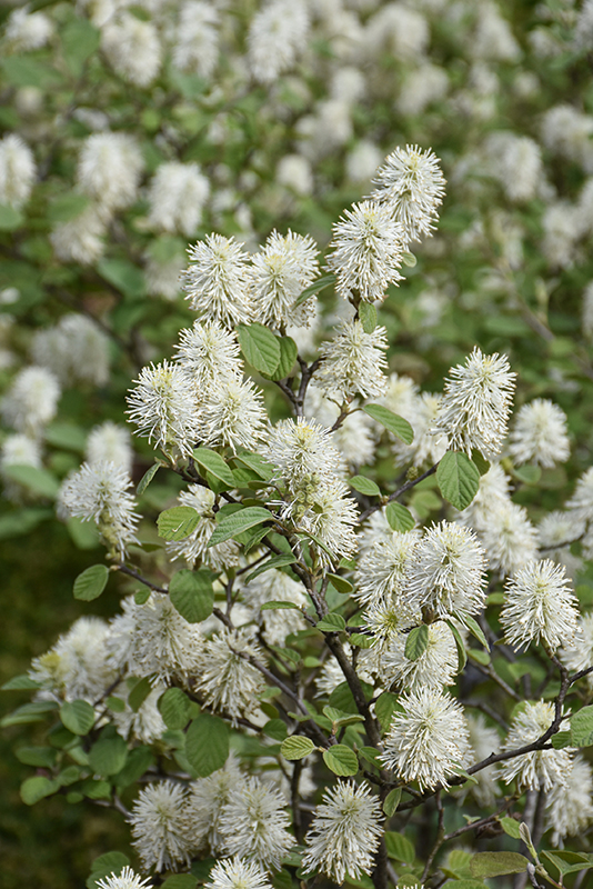 Blue Shadow Fothergilla features showy spikes of fragrant white flowers rising above the foliage in mid spring before the leaves. It has powder blue deciduous foliage. The round leaves turn an outstanding scarlet in the fall.
