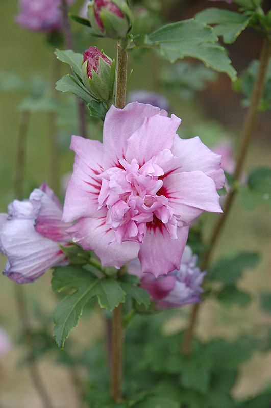 Ardens Rose of Sharon features bold double lilac purple round flowers along the branches from mid summer to early fall. It has green deciduous foliage. The lobed leaves do not develop any appreciable fall color.