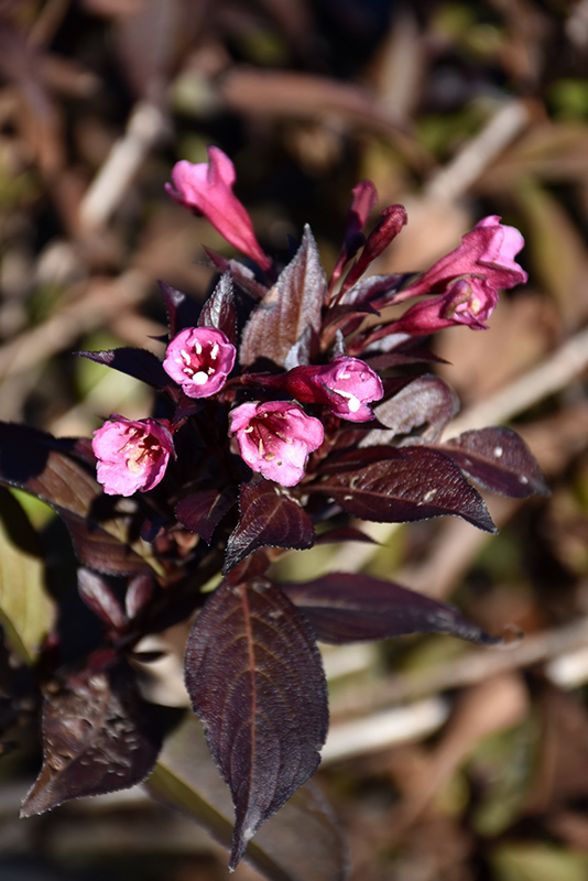 Fine Wine® Weigela features showy clusters of rose trumpet-shaped flowers with hot pink throats along the branches in late spring. It has attractive burgundy deciduous foliage. The pointy leaves are highly ornamental and turn an outstanding deep purple in the fall.